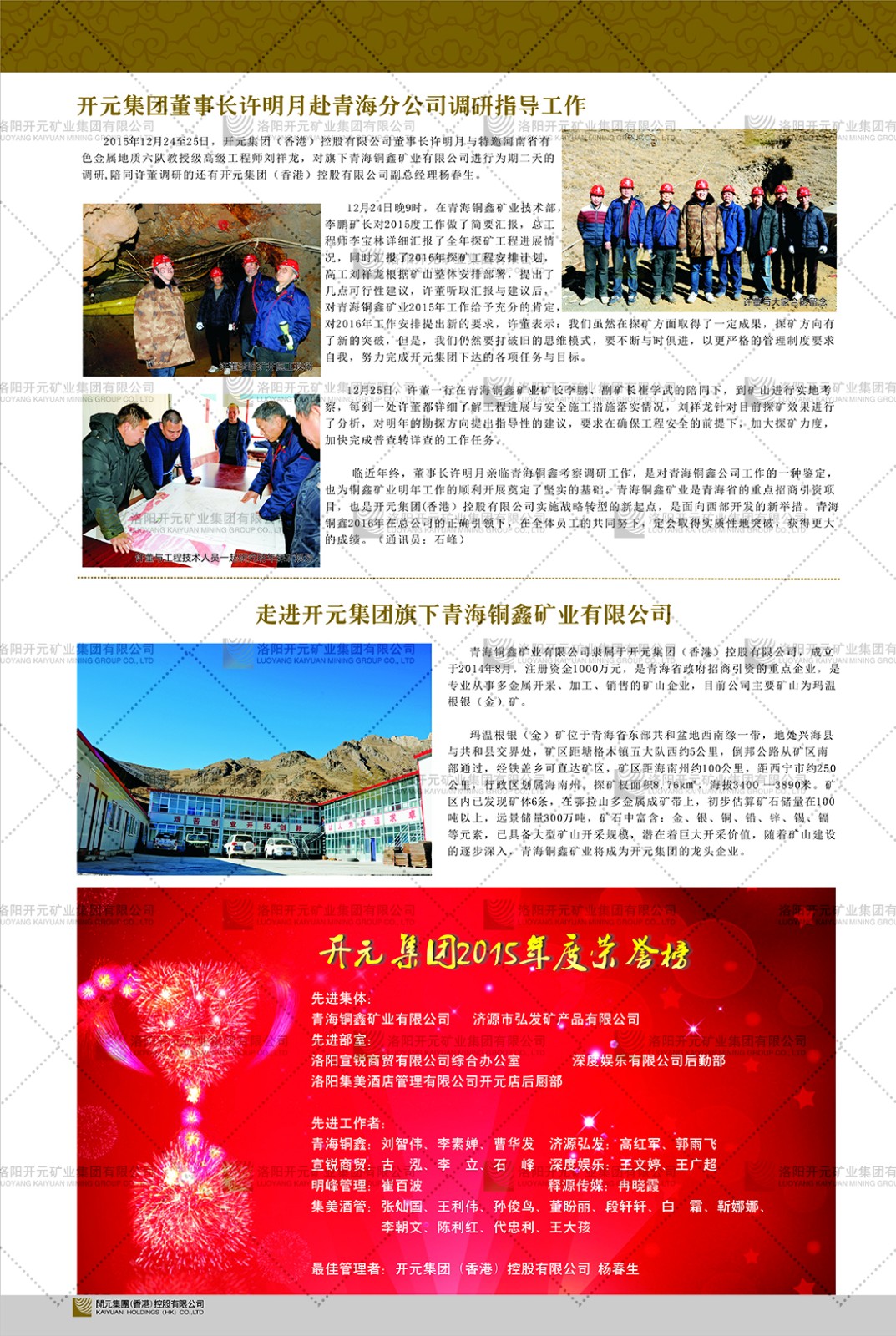 洛陽(yáng)開(kāi)元礦業(yè)集團(tuán)有限公司簡(jiǎn)介洛陽(yáng)開(kāi)元礦業(yè)集團(tuán)有限公司,始成立于2006年,位于洛陽(yáng)市開(kāi)元大道269號(hào)。集團(tuán)旗下共有五余家全資子公司,業(yè)務(wù)涉及有色金屬礦山開(kāi)發(fā)、礦產(chǎn)品購(gòu)銷(xiāo)與進(jìn)出口貿(mào)易、房地產(chǎn)開(kāi)發(fā)、文化藝術(shù)、企業(yè)管理與咨詢(xún)、資本投資等多個(gè)領(lǐng)域。民建河南省委委員、民建河南省委企業(yè)委副主任、民建洛陽(yáng)市委委員、企業(yè)委主任、洛陽(yáng)民建企業(yè)家協(xié)會(huì)會(huì)長(zhǎng)許明月是公司創(chuàng)始人,現(xiàn)任洛陽(yáng)開(kāi)元礦業(yè)集團(tuán)有限公司董事長(zhǎng)。在礦業(yè)領(lǐng)域,洛陽(yáng)開(kāi)元礦業(yè)集團(tuán)擁有多家實(shí)力雄厚的子公司:貴州開(kāi)元礦業(yè)有限公司探、采礦權(quán)面積共11.33平方公里;興??h銅鑫礦業(yè)有限公司探礦權(quán)面積8.76平方公里,礦山資源潛力巨大;2021年,開(kāi)元集團(tuán)與盧氏中科礦業(yè)有限公司開(kāi)展戰(zhàn)略合作。盧氏中科礦業(yè)有限公司專(zhuān)注于有色金屬的浮選、加工和銷(xiāo)售,擁有強(qiáng)大的技術(shù)支撐平臺(tái),是集探、采、選、冶、研為一體的中大型綜合礦業(yè)企業(yè)。目前,盧氏中科王家河1000噸選礦廠已成功投產(chǎn),雙河金礦、柳關(guān)欒盧鉛鋅礦相繼順利開(kāi)工,樓房銀礦與圪老灣鉛鋅礦的深部探礦重大突破,標(biāo)志著礦山版圖取得重大進(jìn)展,為開(kāi)元集團(tuán)后續(xù)發(fā)展奠定了堅(jiān)實(shí)基礎(chǔ)。在文化傳媒領(lǐng)域,洛陽(yáng)市明月美術(shù)館通過(guò)豐富多樣的藝術(shù)展覽、學(xué)術(shù)研討和公共教育活動(dòng),努力打造一個(gè)集展覽、交流、教育、研究為一體的綜合性藝術(shù)平臺(tái)。此外,在金融投資領(lǐng)域,開(kāi)元集團(tuán)旗下的北京明峰資本管理有限公司專(zhuān)注于投資具有高增長(zhǎng)潛力的優(yōu)秀企業(yè),特別是高科技、新能源、環(huán)保等新興產(chǎn)業(yè),為客戶(hù)提供個(gè)性化的資產(chǎn)配置服務(wù)。在做好企業(yè)經(jīng)營(yíng)的同時(shí),開(kāi)元集團(tuán)始終不忘企業(yè)的社會(huì)責(zé)任和家國(guó)情懷,以突出的愛(ài)心公益事跡,開(kāi)展了一系列公益慈善活動(dòng):“民建林”公益事業(yè)通過(guò)“思源基金”“幫幫公益”線上公益平臺(tái),與眾多愛(ài)心人士籌措資金20余萬(wàn)元;資助541名貧困大學(xué)生共計(jì)270余萬(wàn)元,推進(jìn)“數(shù)字助力——河南AI人才培養(yǎng)”;捐款10萬(wàn)元,馳援京津冀、黑龍江洪水地質(zhì)災(zāi)害……公司于2017年底被洛陽(yáng)市慈善總會(huì)評(píng)為“洛陽(yáng)慈善風(fēng)云榜——十大愛(ài)心集體”。洛陽(yáng)開(kāi)元礦業(yè)集團(tuán)有限公司秉承持續(xù)發(fā)展理念,憑借多年來(lái)良好的企業(yè)信譽(yù)與經(jīng)營(yíng)業(yè)績(jī),與全國(guó)多家企業(yè)建立了良好合作關(guān)系,受到社會(huì)各界的一致好評(píng),多次榮獲“納稅標(biāo)兵”“先進(jìn)企業(yè)”“招商引資模范企業(yè)”等榮譽(yù)稱(chēng)號(hào)。回望來(lái)時(shí)路,開(kāi)元人勠力同心,以“闖”的精神和“創(chuàng)”的勁頭,一路披荊斬棘,踏過(guò)千山萬(wàn)水;展望新未來(lái),開(kāi)元人凝心聚力,不執(zhí)于“舊”,無(wú)畏于“新”,秉承“勇于跨越,追求卓越”的企業(yè)精神,乘著國(guó)家高質(zhì)量發(fā)展新征程的東風(fēng),跨過(guò)高山,越過(guò)大海,向著集團(tuán)多元化、國(guó)際化的目標(biāo),逐夢(mèng)遠(yuǎn)航,跨越前行!
