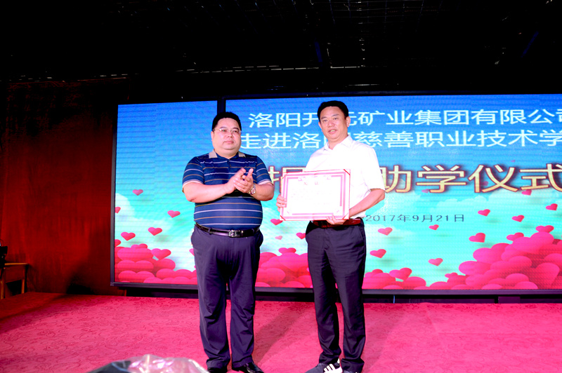 集團(tuán)副總經(jīng)理楊春生代表洛陽開元礦業(yè)集團(tuán)向洛陽慈善職業(yè)技術(shù)學(xué)校捐贈新生校服西裝,洛陽慈善職業(yè)技術(shù)學(xué)校賈國彪校長為洛陽開元礦業(yè)集團(tuán)有限公司頒發(fā)榮譽(yù)證書,并向全校師生展示新校服。