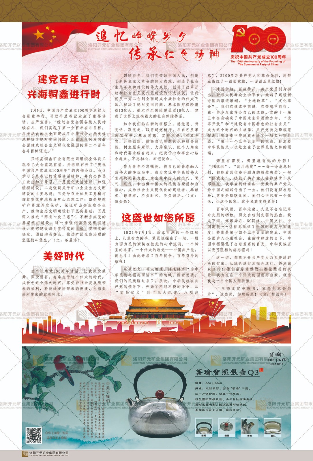 洛陽開元礦業(yè)集團有限公司簡介洛陽開元礦業(yè)集團有限公司,始成立于2006年,位于洛陽市開元大道269號。集團旗下共有五余家全資子公司,業(yè)務涉及有色金屬礦山開發(fā)、礦產品購銷與進出口貿易、房地產開發(fā)、文化藝術、企業(yè)管理與咨詢、資本投資等多個領域。民建河南省委委員、民建河南省委企業(yè)委副主任、民建洛陽市委委員、企業(yè)委主任、洛陽民建企業(yè)家協會會長許明月是公司創(chuàng)始人,現任洛陽開元礦業(yè)集團有限公司董事長。在礦業(yè)領域,洛陽開元礦業(yè)集團擁有多家實力雄厚的子公司:貴州開元礦業(yè)有限公司探、采礦權面積共11.33平方公里;興??h銅鑫礦業(yè)有限公司探礦權面積8.76平方公里,礦山資源潛力巨大;2021年,開元集團與盧氏中科礦業(yè)有限公司開展戰(zhàn)略合作。盧氏中科礦業(yè)有限公司專注于有色金屬的浮選、加工和銷售,擁有強大的技術支撐平臺,是集探、采、選、冶、研為一體的中大型綜合礦業(yè)企業(yè)。目前,盧氏中科王家河1000噸選礦廠已成功投產,雙河金礦、柳關欒盧鉛鋅礦相繼順利開工,樓房銀礦與圪老灣鉛鋅礦的深部探礦重大突破,標志著礦山版圖取得重大進展,為開元集團后續(xù)發(fā)展奠定了堅實基礎。在文化傳媒領域,洛陽市明月美術館通過豐富多樣的藝術展覽、學術研討和公共教育活動,努力打造一個集展覽、交流、教育、研究為一體的綜合性藝術平臺。此外,在金融投資領域,開元集團旗下的北京明峰資本管理有限公司專注于投資具有高增長潛力的優(yōu)秀企業(yè),特別是高科技、新能源、環(huán)保等新興產業(yè),為客戶提供個性化的資產配置服務。在做好企業(yè)經營的同時,開元集團始終不忘企業(yè)的社會責任和家國情懷,以突出的愛心公益事跡,開展了一系列公益慈善活動:“民建林”公益事業(yè)通過“思源基金”“幫幫公益”線上公益平臺,與眾多愛心人士籌措資金20余萬元;資助541名貧困大學生共計270余萬元,推進“數字助力——河南AI人才培養(yǎng)”;捐款10萬元,馳援京津冀、黑龍江洪水地質災害……公司于2017年底被洛陽市慈善總會評為“洛陽慈善風云榜——十大愛心集體”。洛陽開元礦業(yè)集團有限公司秉承持續(xù)發(fā)展理念,憑借多年來良好的企業(yè)信譽與經營業(yè)績,與全國多家企業(yè)建立了良好合作關系,受到社會各界的一致好評,多次榮獲“納稅標兵”“先進企業(yè)”“招商引資模范企業(yè)”等榮譽稱號。回望來時路,開元人勠力同心,以“闖”的精神和“創(chuàng)”的勁頭,一路披荊斬棘,踏過千山萬水;展望新未來,開元人凝心聚力,不執(zhí)于“舊”,無畏于“新”,秉承“勇于跨越,追求卓越”的企業(yè)精神,乘著國家高質量發(fā)展新征程的東風,跨過高山,越過大海,向著集團多元化、國際化的目標,逐夢遠航,跨越前行!